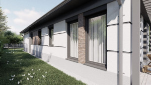 Homlokzati fal: a falon belül 15 cm ásványi szálas szigetelés van, ami kívülről kap standardban 15 cm vastag grafitos EPS hőszigetelést (Thermomaster Grafit Akril hőszigetelő rendszer, fehér színben) U érték 0,135 W/m2K, követelményérték 0,24 W/m2K, azaz követelmény értéknél 40%-al jobb.